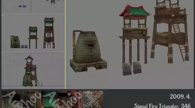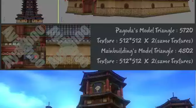 클릭하면 더 크게 보입니다2009년 7월 소림사에 들어가는 건물로 제작된 것입니다.기존의 게임브리오에서는 멀티/서브오브젝트를 적게쓰고 텍스쳐를 크게 쓰는것에 비해, 텍스쳐사이즈는 작게 레이어는 많이 쓰는 방식으로 시험 제작을 했던 것입니다.