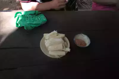 이곳의 마는 한국것과 달리 좀더 고구마 같습니다. 그리고 옆에 조미료는 땅콩과 소금 설탕을 섞은 것인데, 땅굴속에 살다보니, 지방질 보충도 힘들고 그것때문에 부스럼이 많아져서, 넣은 거라 더군요.