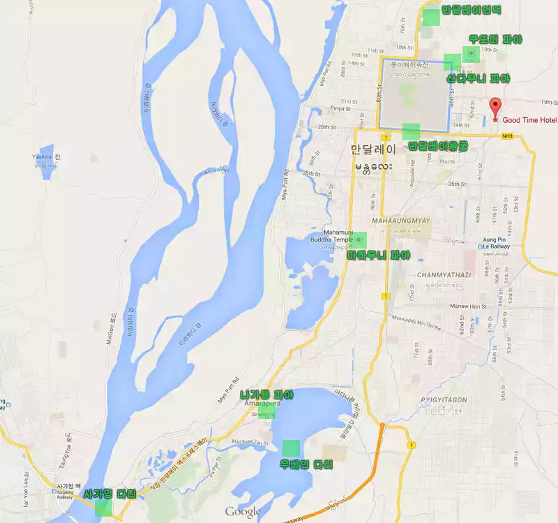 쿠또떠 파야 -> 산다무니 파야 -> 만달레이언덕 -> 사가잉 다리 -> 나가용 파야 -> 마하무니 파야 -> 우베인 다리