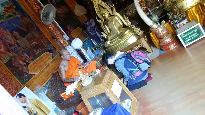 정화의 의식 같았는데, 스님께서 물을 뿌려주고, 손목에 명주실 같은것을 엮어주셨습니다.