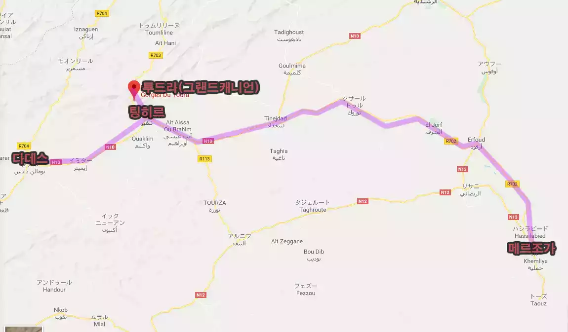 다데스 -> 팅히르 -> 카페트구입 -> 그랜드캐니언 -> 점심 -> 사하라사막입구 -> 1시간낙타이동 -> 도착후 만찬
